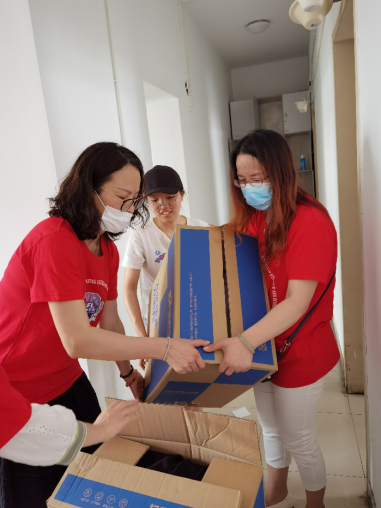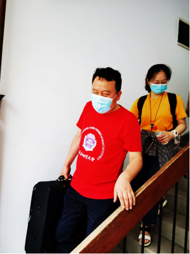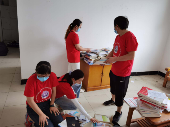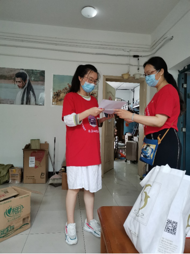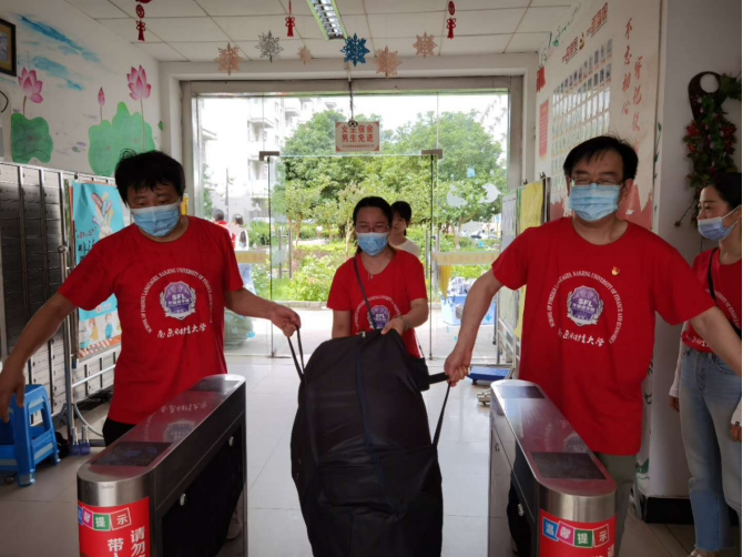 国际合作与交流处党支部书记姚杰、孙弛老师,黄片 教工第二党支部书记周标老师,郑洪举老师,民主党派程水英老师,青年教师洪忠婷来到黄片 女生宿舍,帮助学生打包和运送行李。