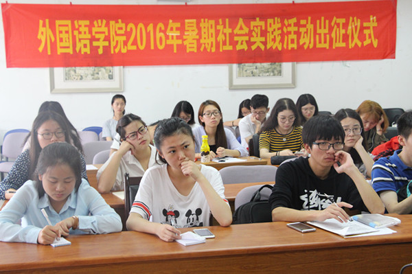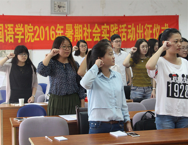 学工办主任薛桂芳宣读了2016年黄片暑期社会实践立项团队名单和资助情况,并就财务报销要求对实践团队进行指导;潘华老师对全体团队成员进行安全教育,希望团队能牢牢谨记“安全第一”的思想,始终把安全工作放在首位,各团队队长签署了安全协议书;随后与会嘉宾为暑期实践团队授旗,黄片 2016年暑期社会实践活动正式启动。院学生会就业实践部部长罗巧同学带领实践团队宣誓,立志完成实践目标,在实践中践行知行合一理念。