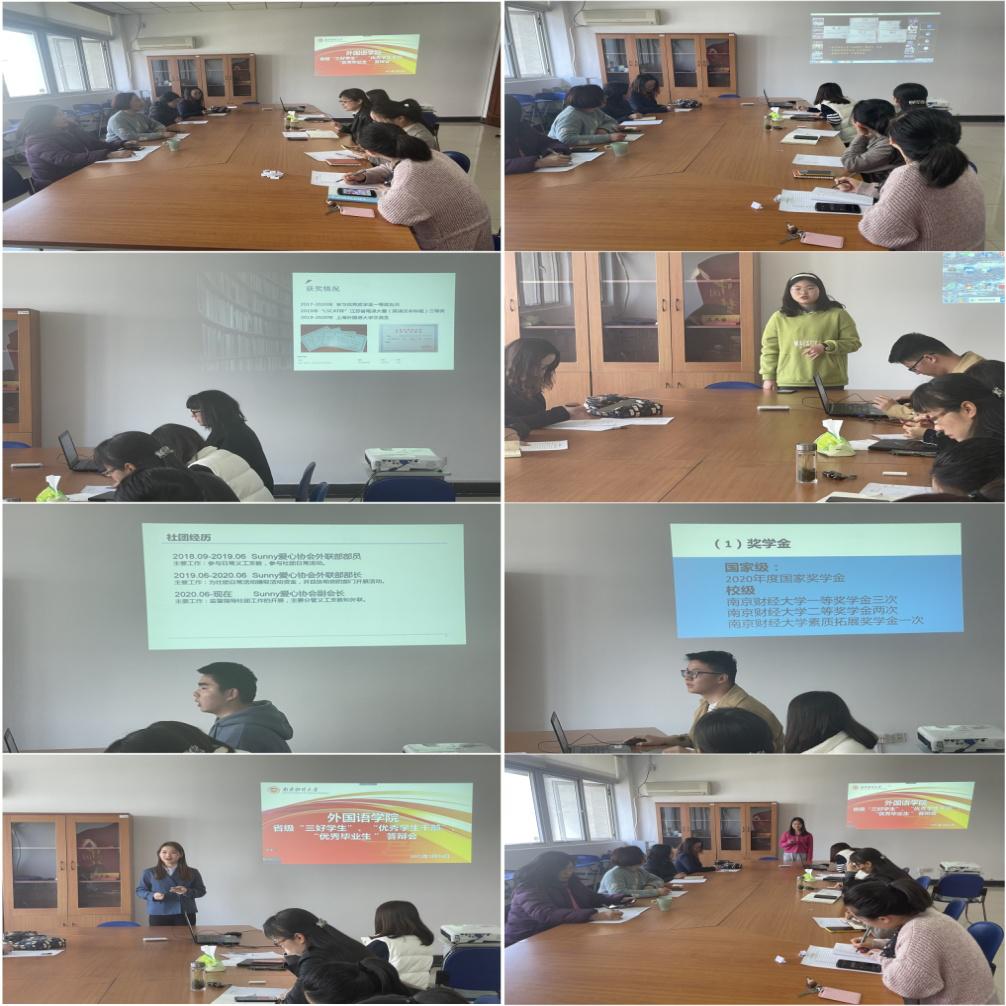 3月26日,我院2021年省级评优答辩会在德正楼325召开。院教工第一党支部书记陈芙蓉,第二党支部书记蒲婧新,院工会主席李丽萍,英语2001班班主任程水英,院学工办主任、分团委书记李超雅,辅导员蒋颖异和黄婕出席答辩会并担任评委,会议由院党委副书记刘英华主持。