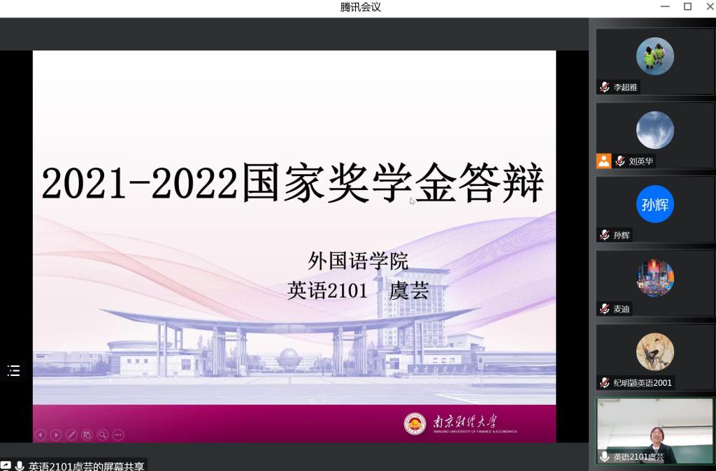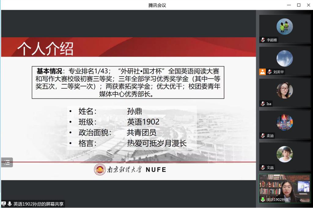 经过前期个人申报和黄片初审,来自黄片 2019、2020、2021级共计4名候选人进入最终的评审环节,按照抽签顺序依次进行答辩。几位候选人分别从思想政治、学业成绩、学科竞赛、社会实践等方面取得的成果进行全方位、多角度的展示。英语1902班孙鼎同学自信、从容、大方,以扎实的专业学习成绩和较强的实践能力给大家留下了深刻印象。