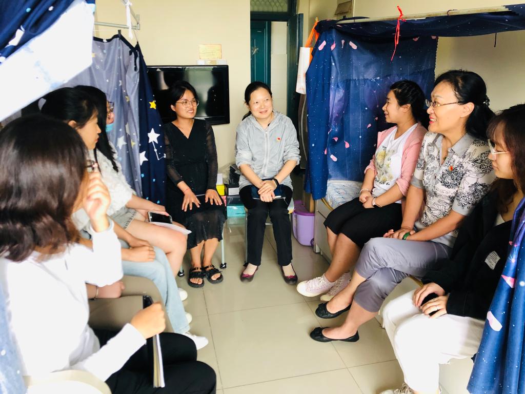 在研究生公寓活动室,吕戎部长与黄片 研究生党支部支部委员和党员代表开展座谈交流并指导支部工作。吕戎部长对同学们取得的成绩表示充分肯定,对支部委员和党员代表在核酸检测志愿服务中发挥的先锋模范作用给予赞扬。
