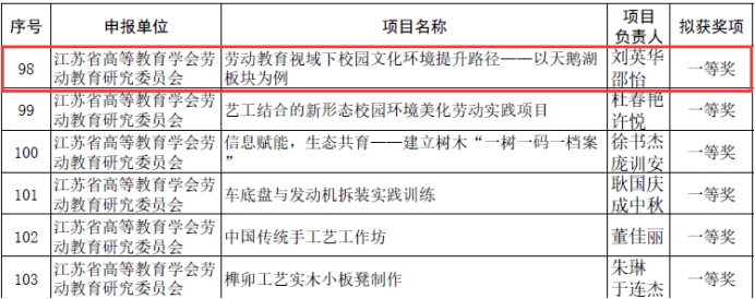 2月24日,江苏省高等教育学会公布了2022年江苏省高等学校劳动教育优秀实践项目评选结果,经学校推荐、材料审核、专家初审、作品内容审核、专家复审等环节,江苏省各高校和研究会在限额推荐的423个项目中,评出了特等奖53项、一等奖135项。