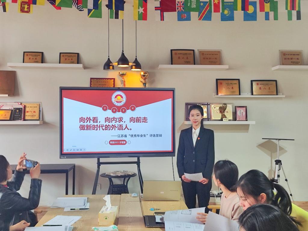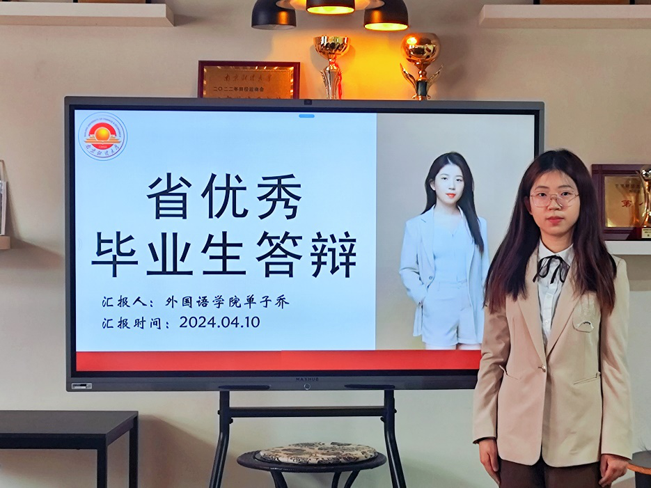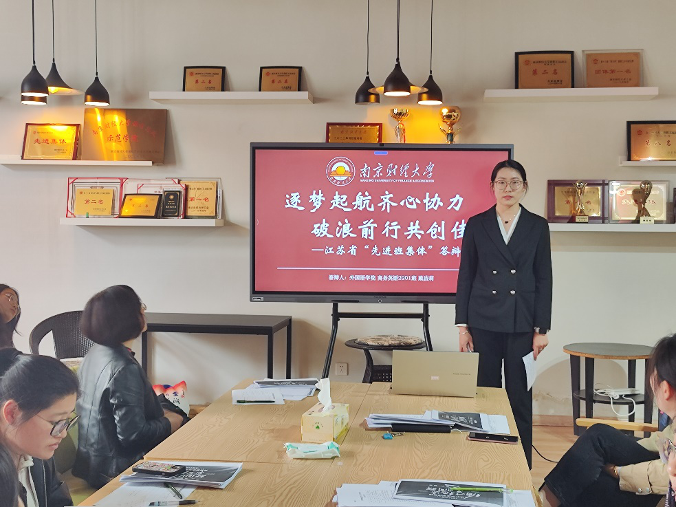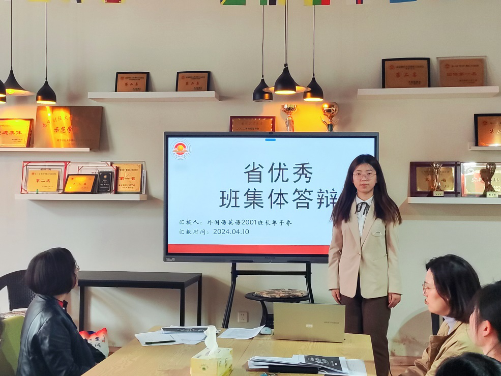 候选人单子乔等5位同学从思想政治、科研学习、社会实践及志愿服务、对外交流等五个方面进行展示。优秀学生干部候选人陈思彤着重就学生会工作成果进行了精彩的分享,向同学们全方位的展示了一名优秀学生干部应有的风采。稳居前列的学习成绩、数十项省部级奖项、丰富的社会实践及志愿服务经历不断震撼着到场同学的内心。随后,英语2001班班长单子乔及商务英语2201班班长戴洁莉分别介绍了班集体自入学以来在思想、学习、科研等方面的丰硕成果,让在场观众领略到团结一心、不断进取的班级风貌。六位杰出的学生单子乔、于雪莲、罗锦、陈思彤、高敏和戴洁莉均展现了他们的才华与实力,这场答辩会不仅是对学生个人成就和班集体建设成果的肯定,也是对同学们未来的展望。