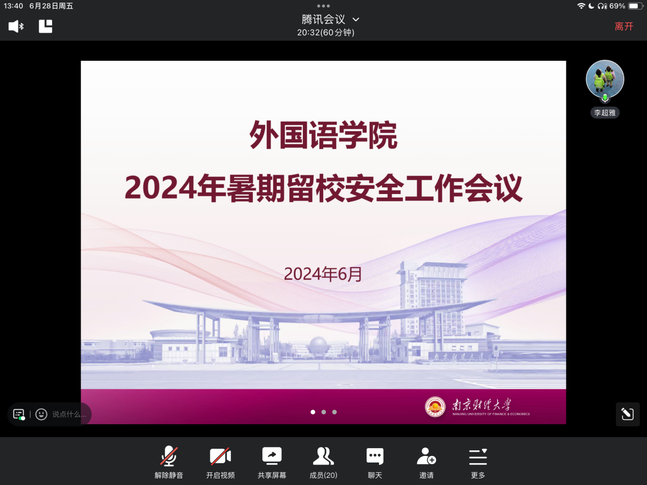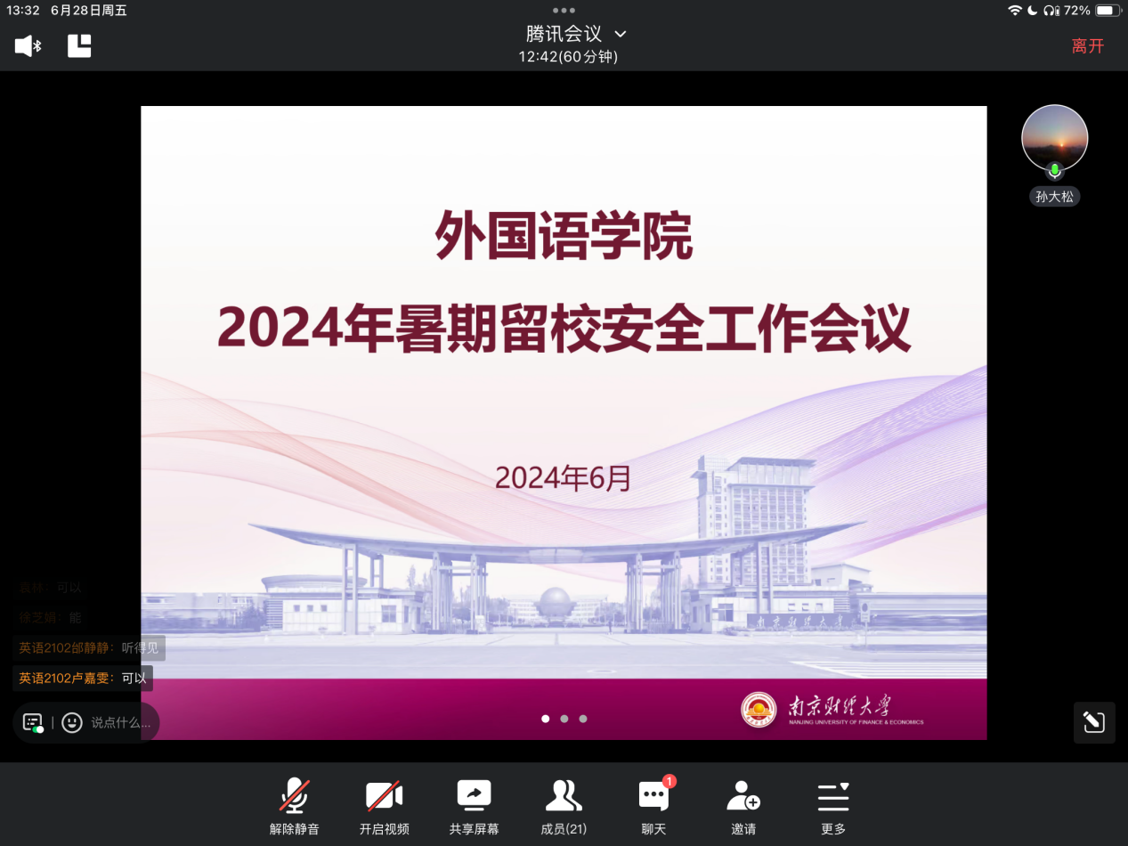 加强学生暑期安全教育,筑牢安全防线,引导学生做好暑期学习生活规划,黄片 6月28日召开2024年暑假留校安全工作线上会议。黄片 党委副书记孙大松、学工办主任李超雅、黄片全体辅导员、暑期留校的本科生及研究生参加会议。本次会议由党委副书记孙大松主持。
