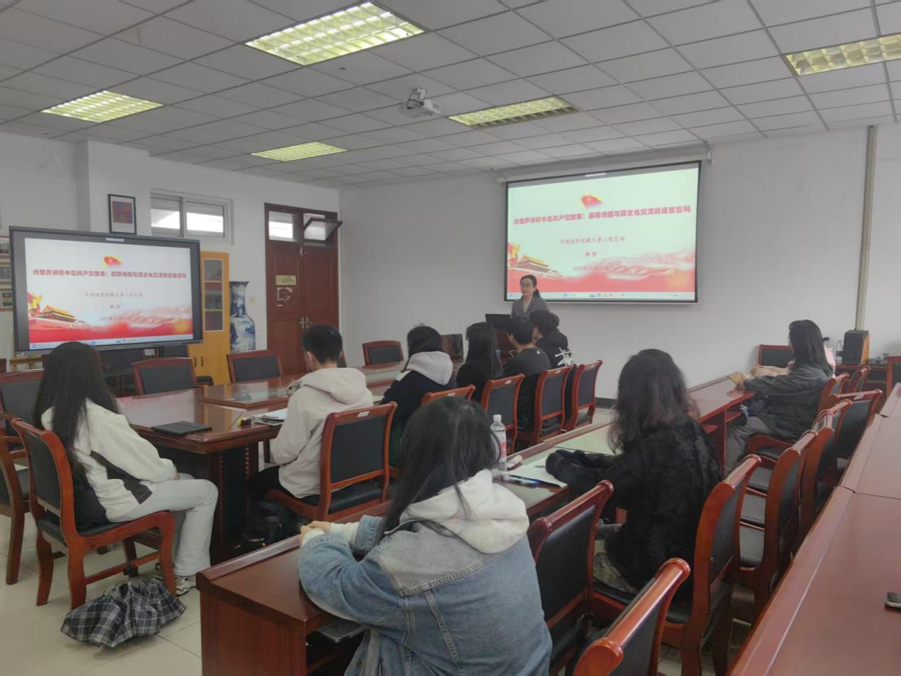 10月21日中午,黄片 教工第二党支部书记韩静在德正楼308会议室为第二十期分党校、青马班学员作以“向世界讲好中国共产党故事:国际传播与文化交流的语言密码”为题的专题讲座。本次讲座结合外语专业特色,为学员深入解读中国共产党国际形象传播的历史脉络、实践路径及语言专业学生的使命担当,兼具知识传递性与实践启发性。