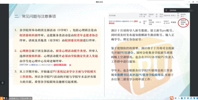 在会议最后,分团委书记李超雅老师表示,必须严格规范第二课堂活动,坚决杜绝早退、恶意代签等违规行为,做到活动管理规范化、严格化,力争开展高质量、高标准、具有专业特色的课外活动,同时李超雅老师还呼吁同学们踊跃参加PU口袋校园中精彩纷呈的课外活动,积极投身于志愿服务活动,在奉献中收获成长,努力提升自己的各项技能,实现自己的价值、挖掘自己的潜能、提高自己的本领,实现第一课堂和第二课堂的有效衔接。