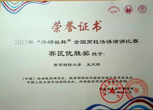 近日,“外研社杯”第十届全国法语演讲比赛中赛区赛落幕,黄片 法语1501班王沁晔同学在荣获赛区优胜奖。