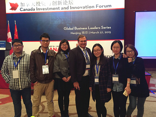 3月27日下午,黄片 推荐组织了6名研究生及2名本科学生赴南京索菲特银河大酒店参加“加拿大投资与创新论坛”,参与口译实习,南京大学黄片 曹建新教授担任此次实习指导。