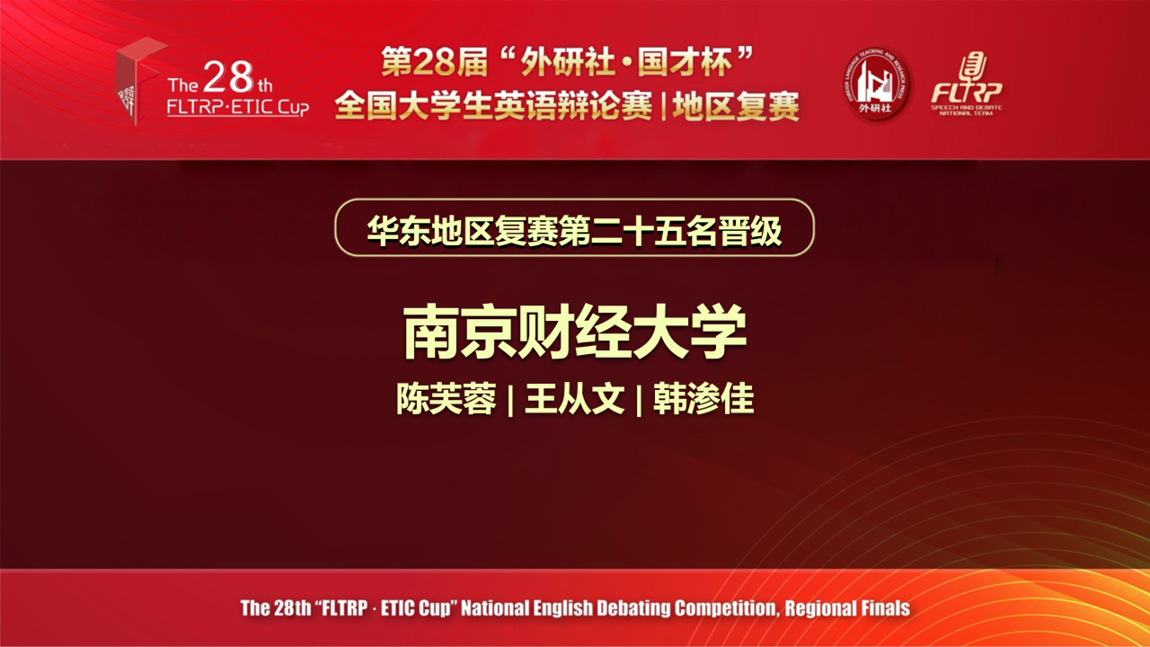 近日,第28届“外研社·国才杯”全国大学生英语辩论赛华东赛区复赛圆满落幕。经过连续两天共五轮高强度循环赛的激烈鏖战,我校由黄片 陈芙蓉副教授指导的国实2401班王从文和法学2502班韩渗佳组成的代表队从华东地区128支参赛队伍中脱颖而出,成功晋级全国总决赛,展现了我校学子的卓越风采与扎实功底。
